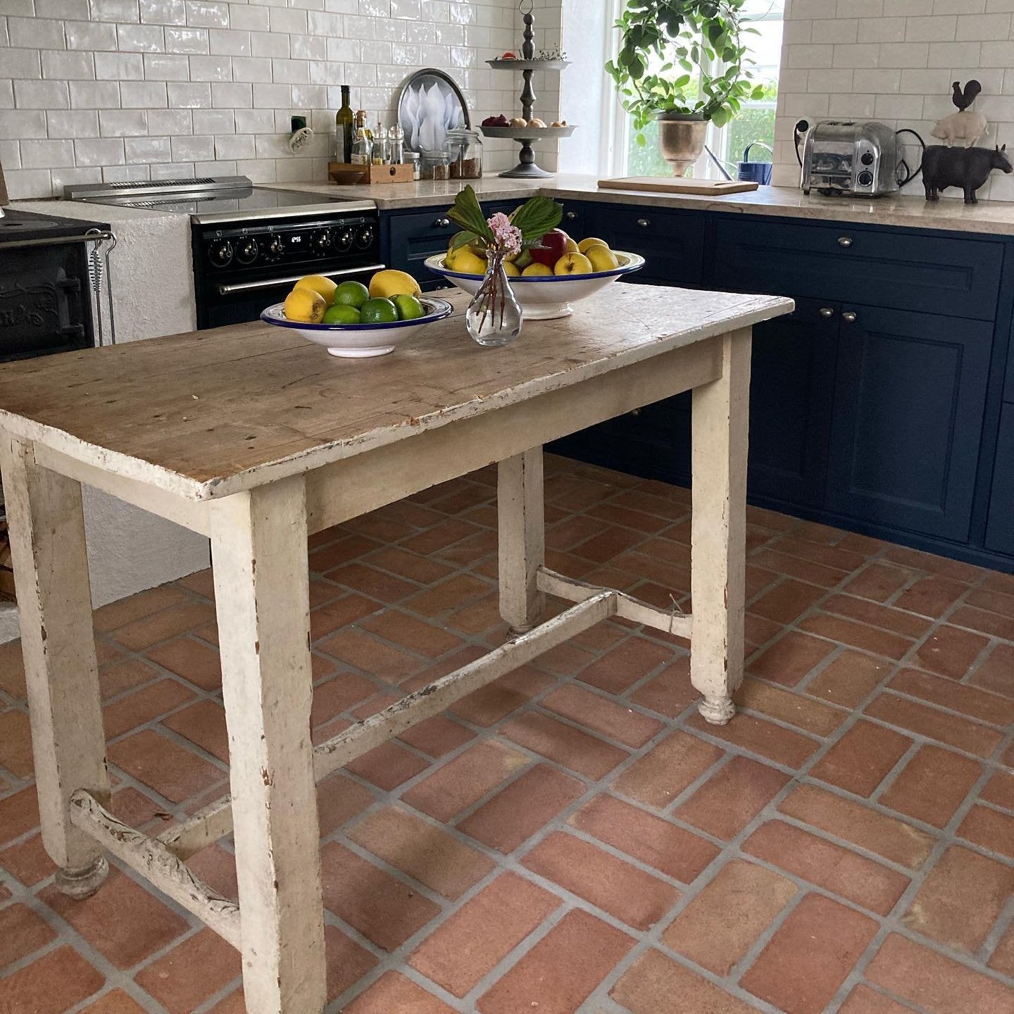 Ein Ziegelboden verleiht der Landhausküche einen authentischen, natürlichen Charme. Ziegel ist sowohl strapazierfähig als auch pflegeleicht, was ihn ideal für lebhafte Küchen macht. Um den Boden in Bestform zu halten, empfehlen wir, ihn regelmäßig zu imprägnieren – das schützt vor Flecken und erleichtert die Reinigung.