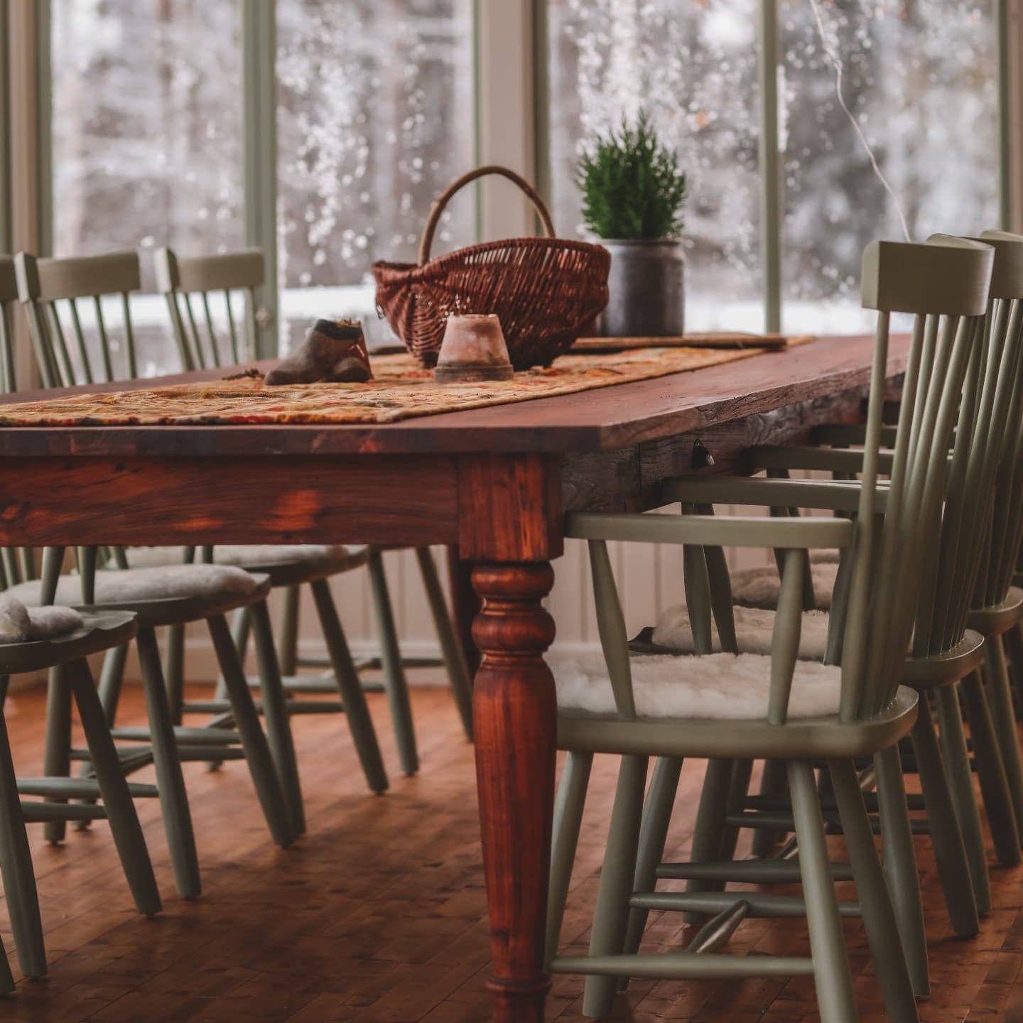 Ein großer Esstisch im französischen Landhausstil wird zum natürlichen Mittelpunkt der Küche. Wählen Sie einen Massivholztisch mit schöner Maserung und rustikalem Finish für ein authentisches Gefühl. Kombinieren Sie ihn mit gepolsterten Stühlen oder Holzbanken, um eine charmante und gemütliche Atmosphäre zu schaffen, in der Familie und Freunde sowohl zum alltäglichen als auch zum festlichen Essen zusammenkommen können.