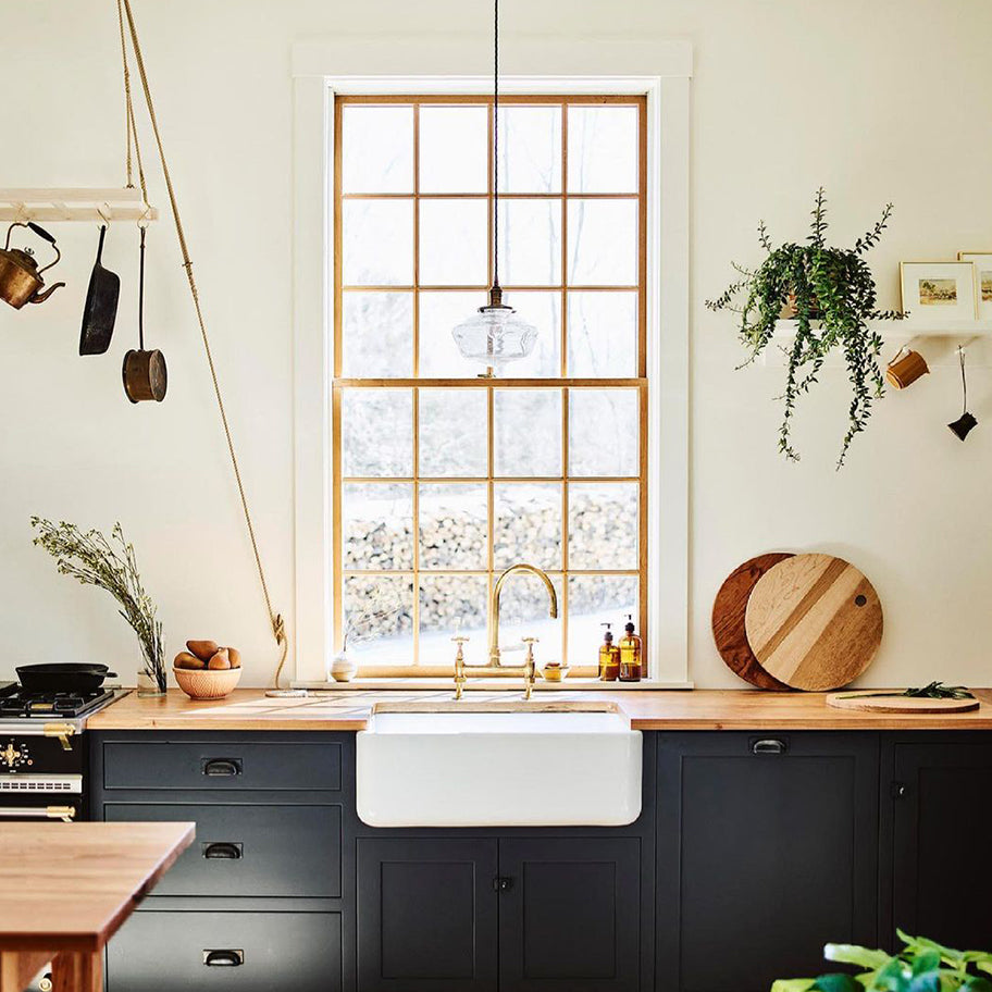 Eine weiße Keramikspüle ist in einer Landhausküche beinahe ein Muss. Sie wirkt robust und vermittelt einen traditionellen Ausdruck, der perfekt zum Ziegelboden und anderen rustikalen Elementen passt. Wählen Sie eine große Spüle mit viel Platz für das Abwaschen und Spülen – ideal für einen aktiven Alltag.
