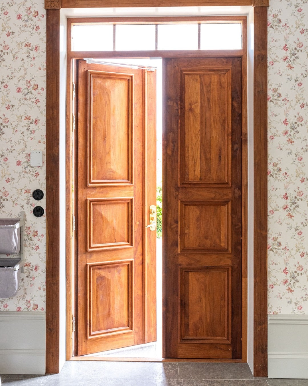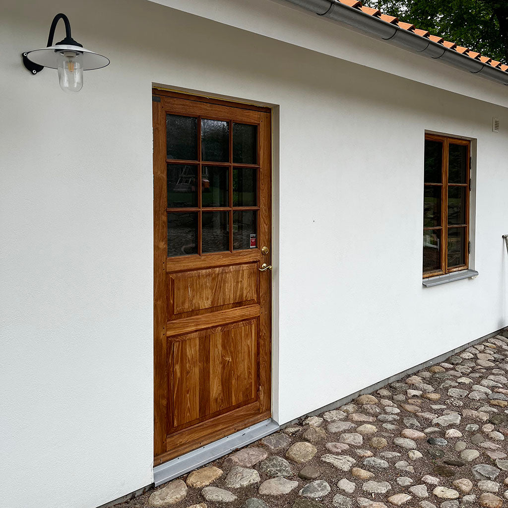 Brantevik pardörr i oljad teak. Modellen nytillverkas efter en gammal traditionell modell av pardörr från Österlen.