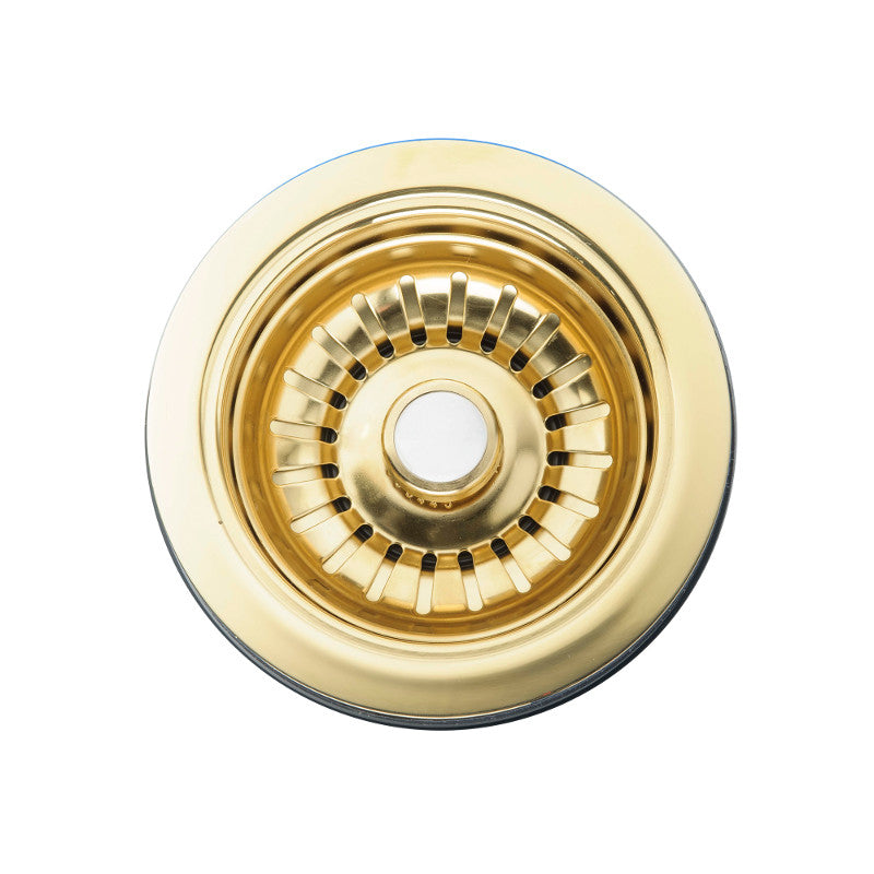 Bottenventil space saver med korgsil till Shaws diskhoar, anpassad för att passa i 3,5” (90 mm) avloppshål. Korgsilen går att lyfta upp för att tömma i sophink vid behov. När korgen trycks nedåt stängs ventilen och diskhon kan fyllas upp. Den vita delen i mitten på korgsilen är en dekorativ porslinsknapp. Ytbehandlingen är guldfärgad, vilket ger ett elegant uttryck. Fördelen med space saver-bottenventilen är att den inte kräver lika mycket utrymme under diskhon som standardventilen. Det gör det enklare med sopkorgar och annat som kan finnas i utrymmet under.