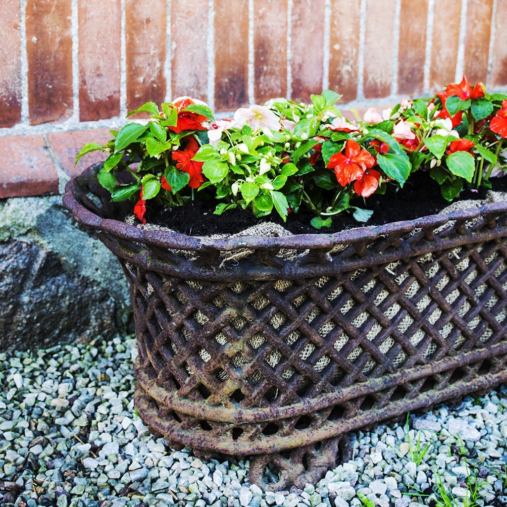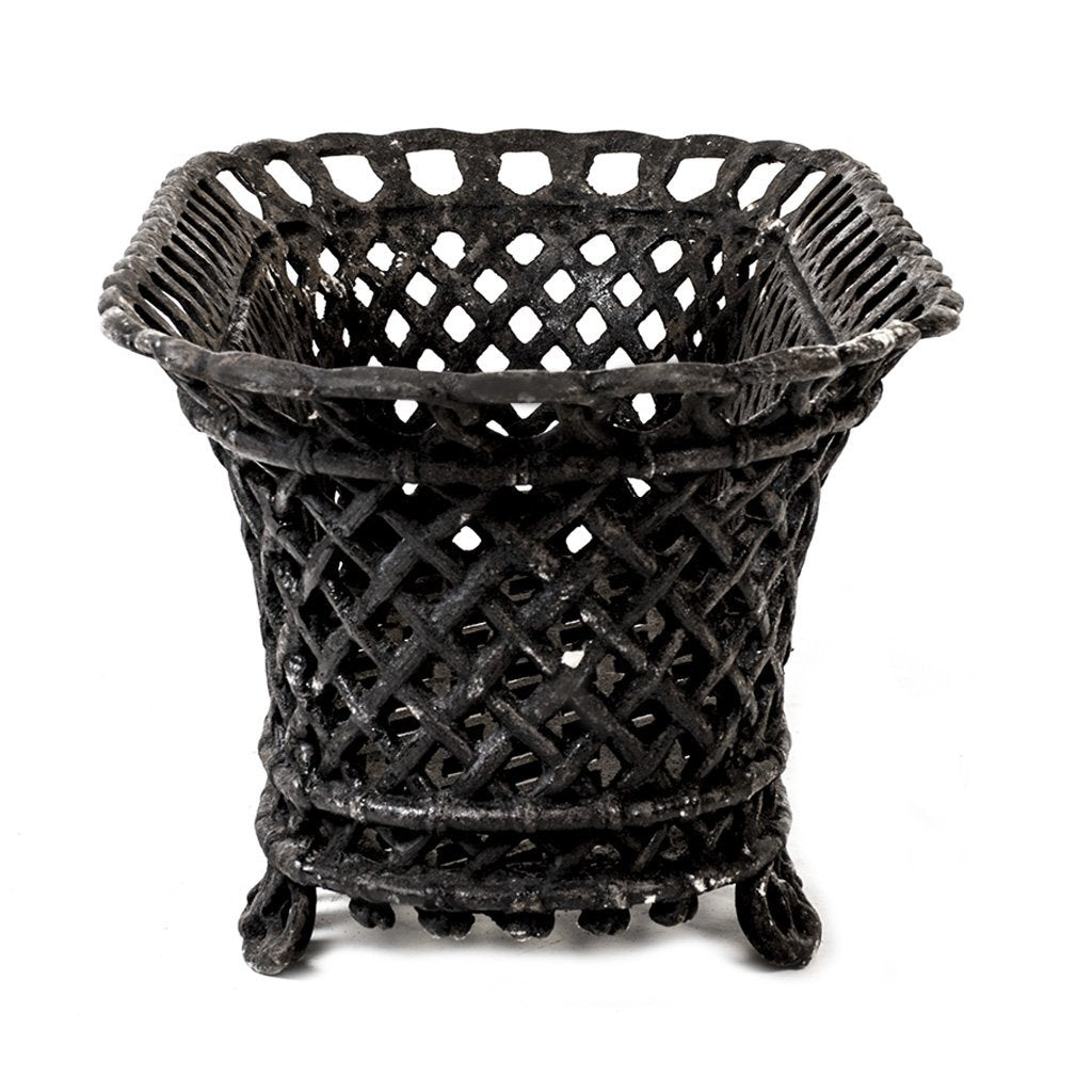 Großer durchbrochener ovaler Gusseisen-Topf in schöner Ausführung, der auf Füßen steht.