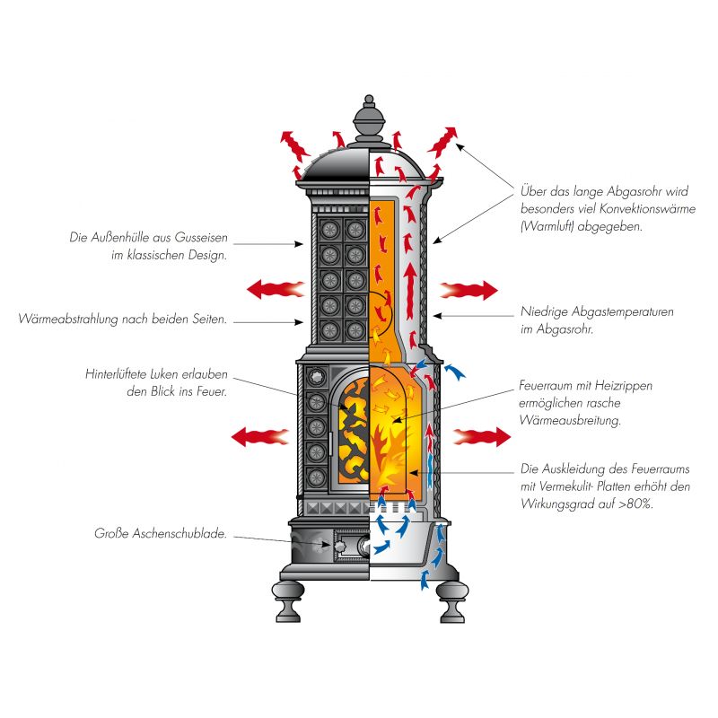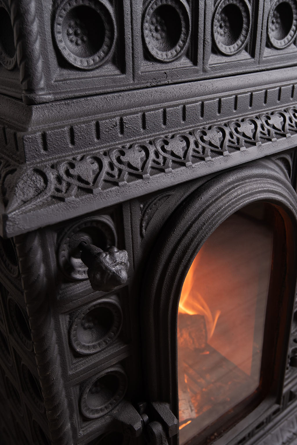 Der Royal Viking ist ein 150 Jahre altes Modell, das neu produziert wird. Hinter der gemusterten Oberfläche verbirgt sich eine solide Konstruktion mit moderner Technik. Durch seine Konstruktion hat Royal Viking einen bis zu 80 % hohen Wirkungsgrad und zudem eine große wärmeableitende Oberfläche. Der Kaminofen hat einen besonders langen Abgasweg, was bedeutet, dass ein großer Teil der Wärme aus den Abgasen genutzt wird. Die Wärme wird zum Teil als Strahlungswärme und zum Teil dadurch abgegeben, dass die Luft zwischen den Wänden des Ofens zirkuliert und ausströmt. Die Gussbauteile haben außerdem eine gute Wärmespeicherkapazität, was bedeutet, dass der Ofen eine lange Nachwärme abgibt. Royal Viking hat außerdem luftreinigende Glasflächen, die ein Verrußen des Glases verhindern und Ihnen die gewünschte Sicht auf das Feuer ermöglichen.