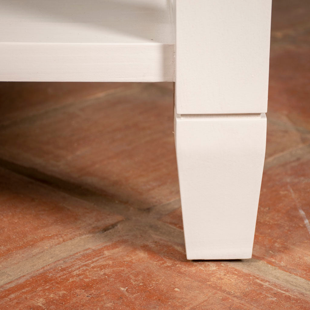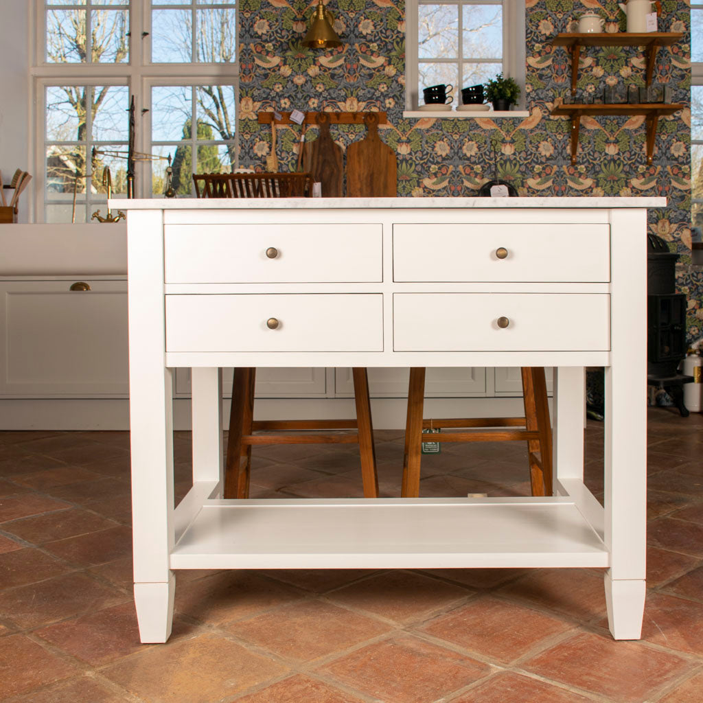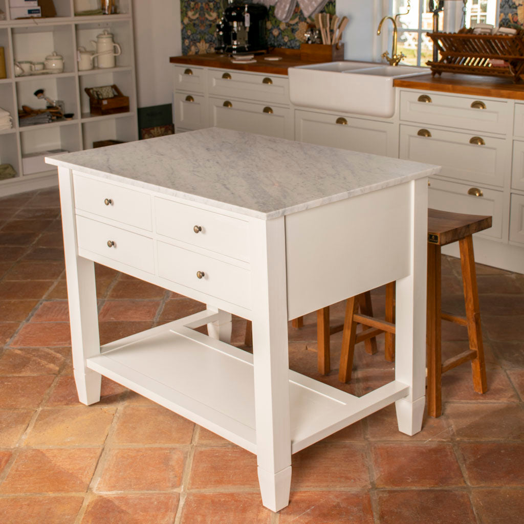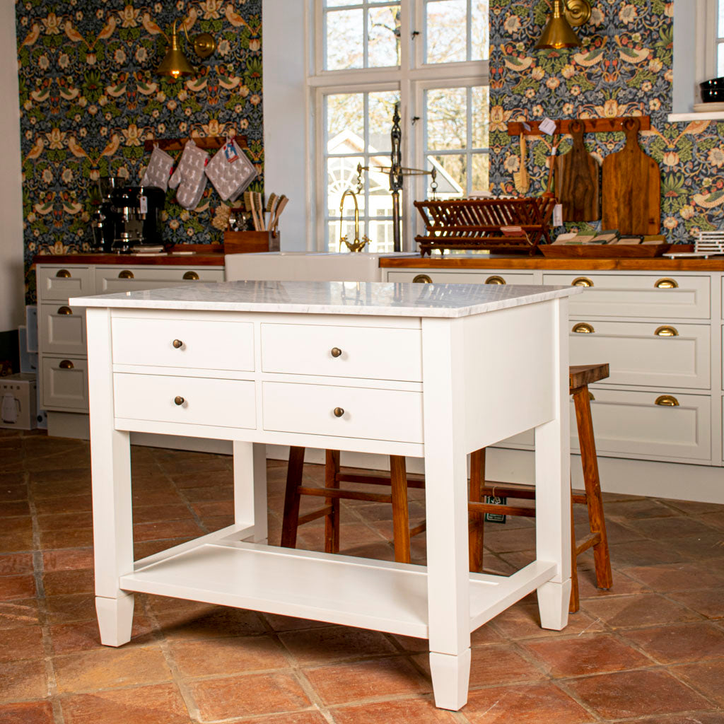 Die Kücheninsel Siri ist sowohl praktisch als auch schön und wird schnell zum Mittelpunkt der Küche. Die weiß lackierte Kücheninsel ist stilvoll und passt daher zu verschiedenen Arten von Küchen. An einer langen Seite befinden sich vier Schubladen, die viel Stauraum bieten, und auf der gegenüberliegenden Seite können problemlos ein paar Barhocker platziert werden. Eine Kücheninsel ist sowohl praktisch als auch sozial. Sie wird leicht zum natürlichen Treffpunkt der Küche für Hausaufgaben oder gesellige Zusammenkünfte bei Abendessen oder Partys. Unter der Kücheninsel befindet sich ein Regal, in dem zum Beispiel Töpfe, Schüsseln oder Kochbücher aufbewahrt werden können. Die Kücheninsel wird mit schwarzoxidierten Messingknöpfen geliefert. Das Gestell und die Marmorplatte werden in separaten Paketen geliefert, und die Marmorplatte wird auf die Kücheninsel gelegt, wenn sie aufgestellt ist. Denken Sie daran, dass Marmor ein Naturmaterial ist und dass die Bilder des Produkts nur als Richtlinie dienen, aber es kann Unterschiede zwischen verschiedenen Marmorplatten geben.