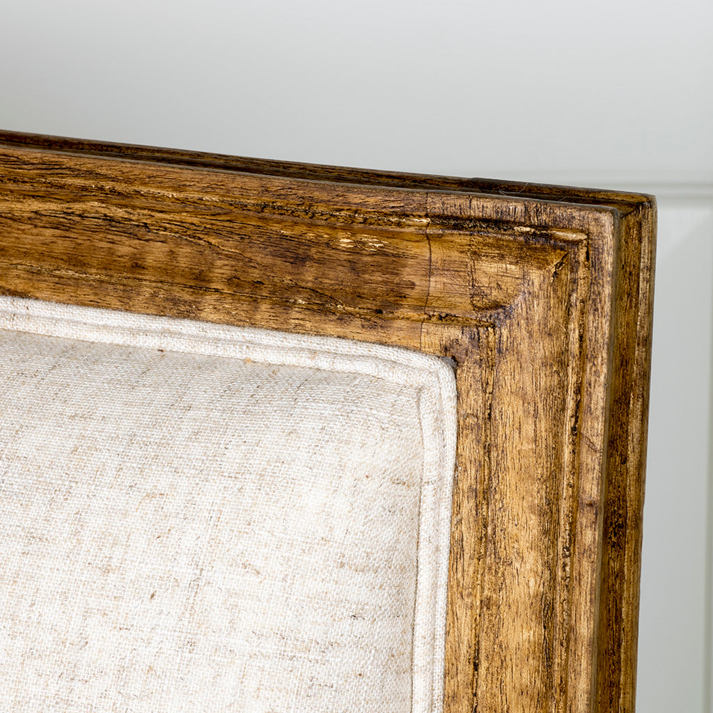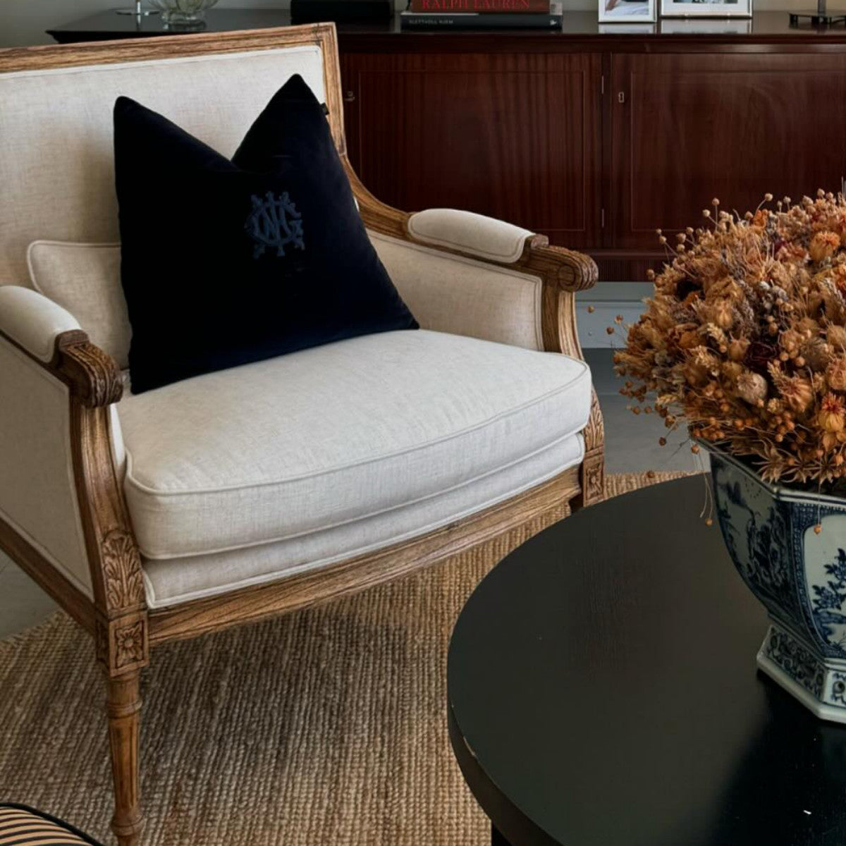 Ein klassischer Sessel, der mit dem Empire-Stil spielt. Rahmen aus dunklem Holz (Mindi), gepolsterter Sitz, Rückenlehne und Armlehnen sowie Kissen. Helles beige-meliertes Bezugsstoff aus 100% strapazierfähiger Baumwolle. Ein lose Kissen aus dem gleichen Stoff wie der Bezug. Runde gedrehte Beine und schöne geschnitzte Details.
