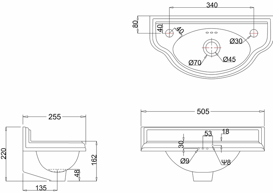 Burlington Classic JR ist ein kleines, sauberes Waschbecken, nur 500 mm breit und mit zwei Aussparungen für Armaturen. Die Bohrungen für die Mischbatterien sind 30 mm groß, so dass Standard-Lavoir-Armaturen und Mini-Mischbatterien passen. Die Mini-Mischbatterien wird dann leicht schräg in ein Hahnloch gestellt und das andere mit einer passenden Abdeckplatte abgedeckt oder für eine Seifenpumpe verwendet. Die Ablassöffnung hat Standardabmessungen und passt zu jedem Bodenventil. Die Wasserhähne auf den Bildern sind nicht käuflich zu erwerben. Das Waschbecken hat eine Kettenhalterung, d. h. ein kleines Loch, an dem die Kette vom Bodenventil aus befestigt wird. Alle Waschbecken und Toiletten der Burlington-Serie haben eine sogenannte Nanoglasur, wodurch Schmutz und Bakterien nicht so leicht haften bleiben wie auf gewöhnlichem Porzellan. Dies bedeutet auch, dass die Reinigung einfacher ist. Alle Burlington-Produkte sind außerdem CE-zertifiziert und damit für den Einsatz in der gesamten EU zugelassen.