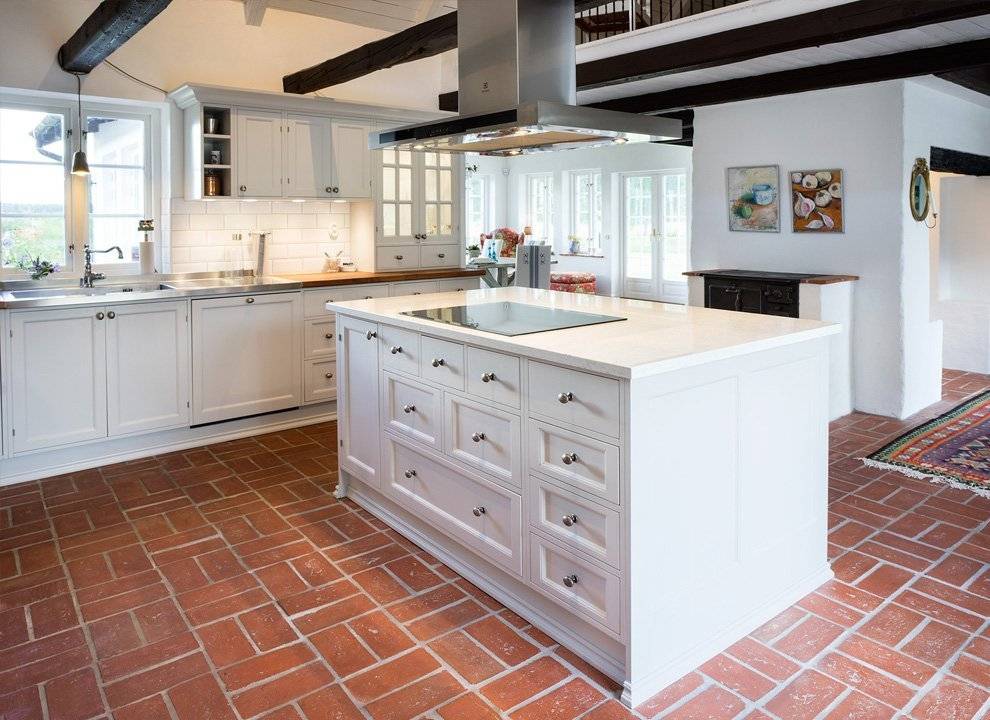 Auch die Küche, die sich im westlichen Teil des Hauses befindet, musste aktualisiert werden, um funktionaler zu werden. Aber genauso wie im übrigen Haus war es wichtig, dass sie einen Stil hatte, der zum Alter und Charakter des Hauses passte. Die Wahl fiel auf eine Qvesarum-Küche, die an die Gegebenheiten des Raumes angepasst werden konnte. Hier befand sich seit langem ein alter Ziegelboden.