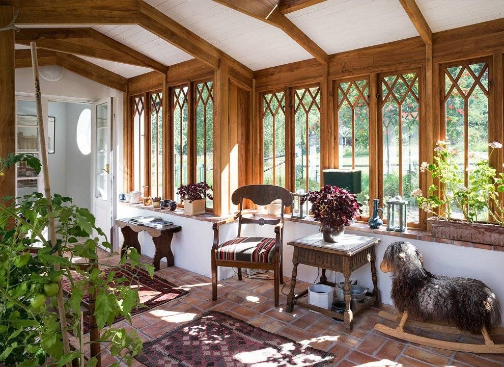 Das Orangerie Victoria aus FSC-zertifiziertem Teakholz hat eine Fläche von 15 Quadratmetern, wurde aber hier durch einen Gang erweitert, der es mit dem Haus verbindet. Carina und Mikael haben es mit schönen alten Möbeln und Teppichen eingerichtet, die eine warme und gemütliche Atmosphäre schaffen. In den Fenstern stehen schöne Keramiken, die Carinas Eltern in den 1940er- und 50er-Jahren von dem örtlichen Keramiker Elfstrand gekauft haben.