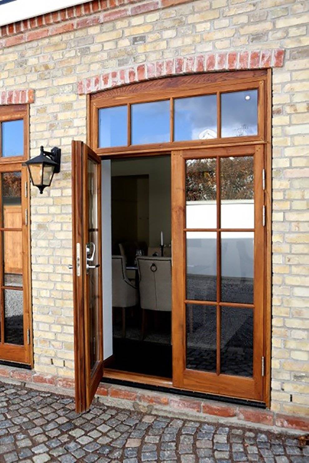 An der Stelle des alten Hüttentors befinden sich jetzt ein großes Sprossenfenster und eine Tür aus Teakholz. Die gewölbten Teakholzfenster mit schönen Sprossen befinden sich an der gleichen Stelle wie die ursprünglichen Fenster.