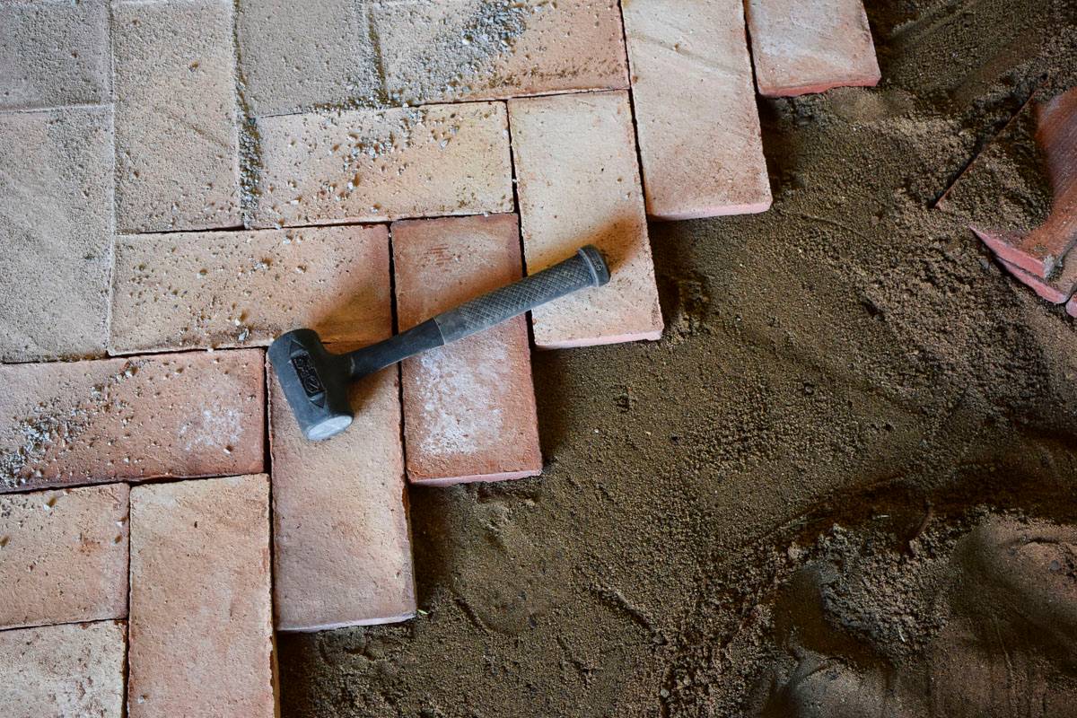 Der Boden wird auf einer Schicht aus hartgepacktem Setzsand verlegt und schwimmt auf dem Sand. Das bedeutet, dass die Steine völlig lose auf dem Sand liegen. Um alle Fliesen an ihrem Platz zu halten, wird Steinmehl zwischen die Fliesen gekehrt, um sie zu fixieren.