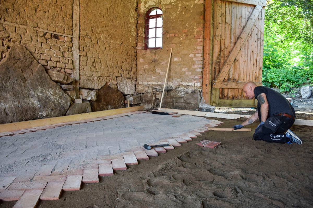 Die Hütte am vierstöckigen Skånegården in Örnaberga in Österlen wird von einem Raum, in dem sich allerlei Müll auf dem gestampften Erdboden angesammelt hat, in einen schönen Versammlungsort verwandelt. Um ein Gefühl von Raum zu schaffen und der Hütte eine anspruchsvolle Atmosphäre zu verleihen, wird ein schöner und rustikaler Ziegelboden von Qvesarum verlegt.