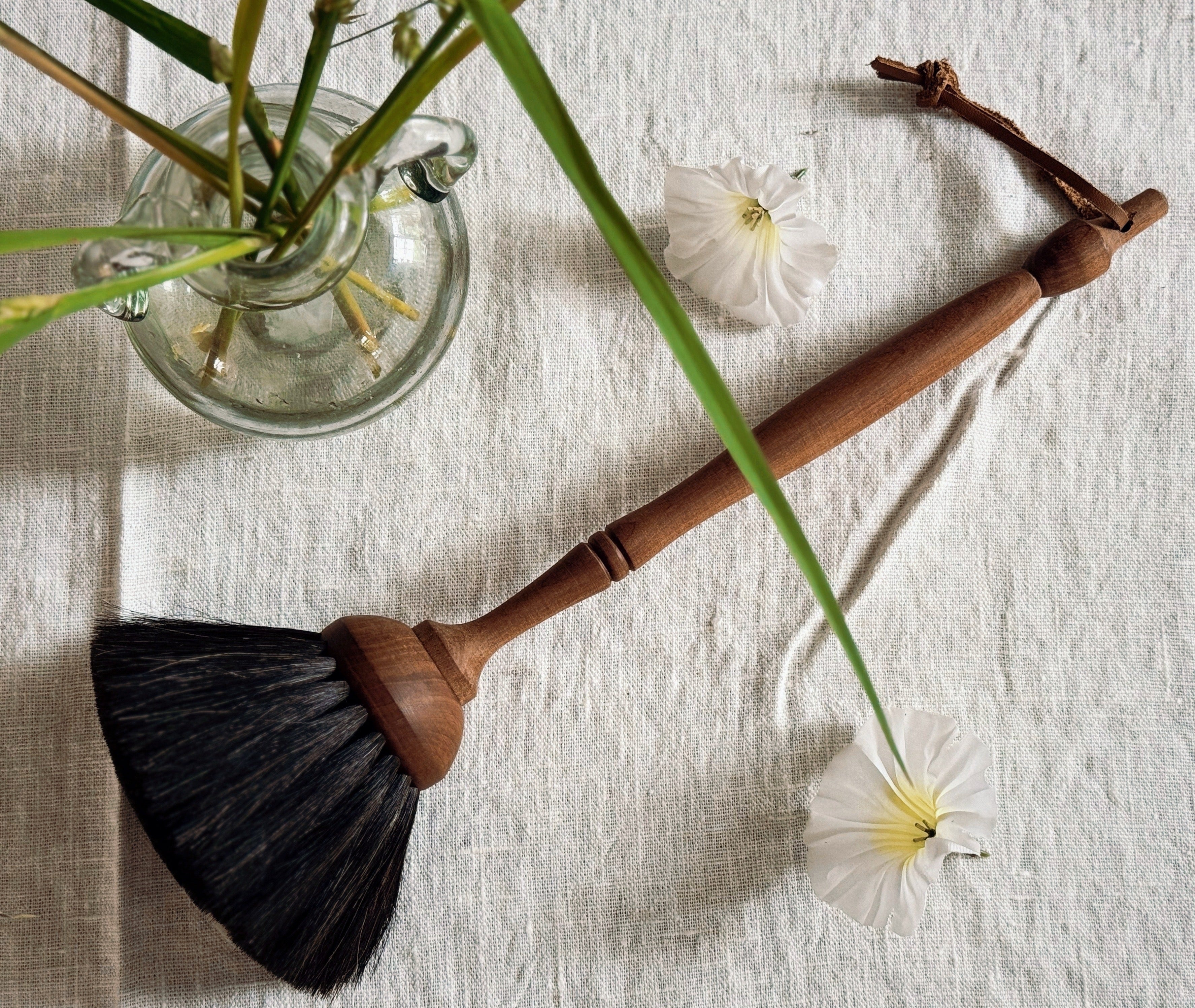 Staubwischer aus dem weichsten Ziegenhaar, um Staub und Haare effektiv zu entfernen. Außerdem dekorativ als Einrichtungsdetail. Schaft aus braunem Holz und Borsten aus schwarzem Ziegenhaar mit weißem Punkt. Staubwischer schwarz