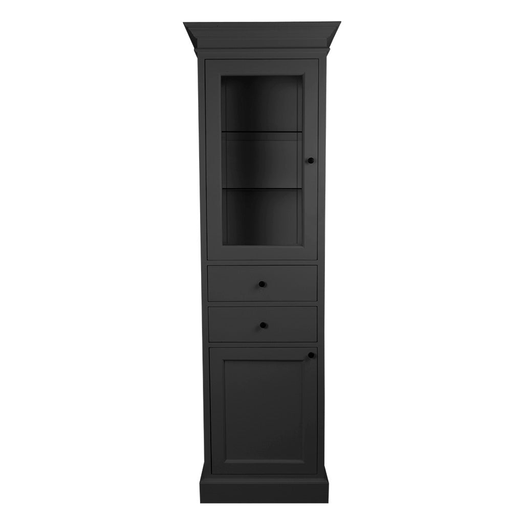 Hochschrank für das Badezimmer im klassischen Stil. Verdeckter Stauraum weiter unten sowie weiterer Stauraum auf der Oberseite des Schrankes hinter Glastüren. Dekorativer Abschluss an der Oberseite. Verstellbare Regalfächer. Dieses Möbelstück wird von Hand aus Massivholz und MDF gefertigt und verfügt im oberen Teil über Türen und Regalböden aus Glas. Der Schrank ist von Hand in einem dunkelgrauen, schönen Farbton bemalt. Ein schöner Hochschrank im klassischen Stil, der sich für ein Badezimmer im alten Stil in einem neuen oder alten Haus eignet.