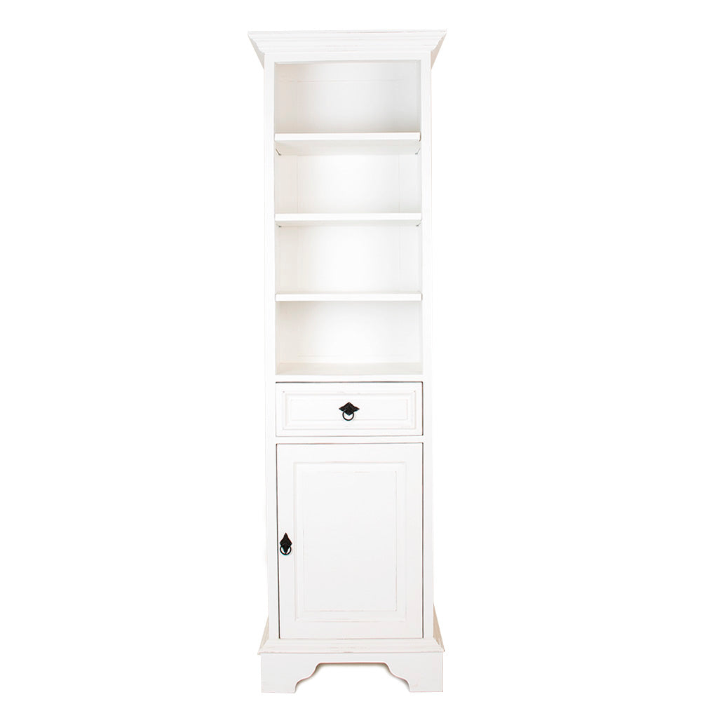 Ein Hochschrank im klassischen Stil mit offenen Regalen oben, Schublade und Schrank unten. Eignet sich ausgezeichnet für ein altes Badezimmer oder auch ein neues Badezimmer im traditionellen Stil sowie zur Aufbewahrung in Küche, Esszimmer oder Wohnzimmer. Die Kombination aus Schubladen und Schränken bietet viel Stauraum. Alle Regale sind verstellbar. Die Möbel werden von Hand aus massivem Mahagoni und MDF gefertigt, und dann von Hand weiß lackiert. Dieses Möbelstück ist antik patiniert, was bedeutet, dass es ein Finish hat, das vom Zahn der Zeit abgenutzt aussieht. * Für dieses Produkt fällt eine Versandgebühr an