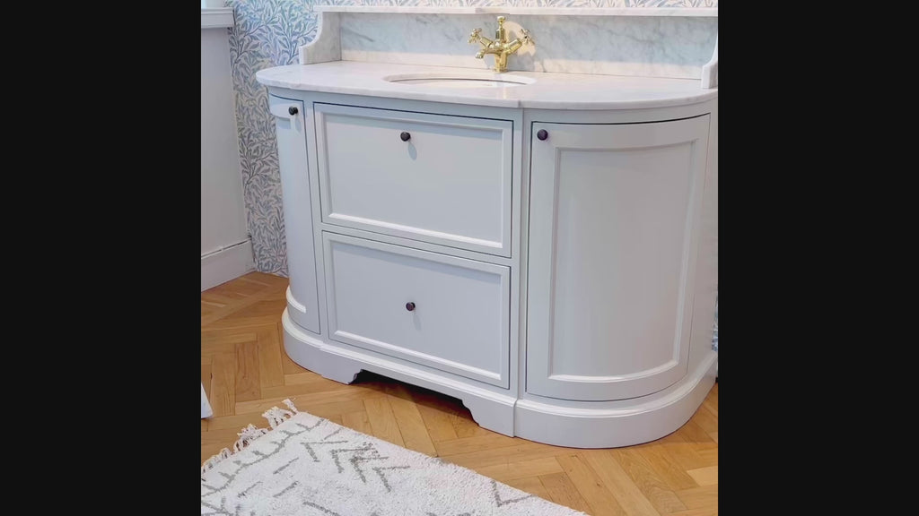 Badezimmerkommode in Hellgrau im klassischen Stil mit abgerundeten Ecken mit geschwungenen Schranktüren. Oberfläche aus Carrara-Marmor und Waschbecken aus weißem Porzellan. Gestell aus Massivholz und MDF, in der Farbe Stormy Grey. Smarte Aufbewahrung in Form einer ausklappbaren Schublade mit Fächern oben, ausziehbarer Schublade unten und zwei abgerundeten Seiten sowie Einlegeböden.