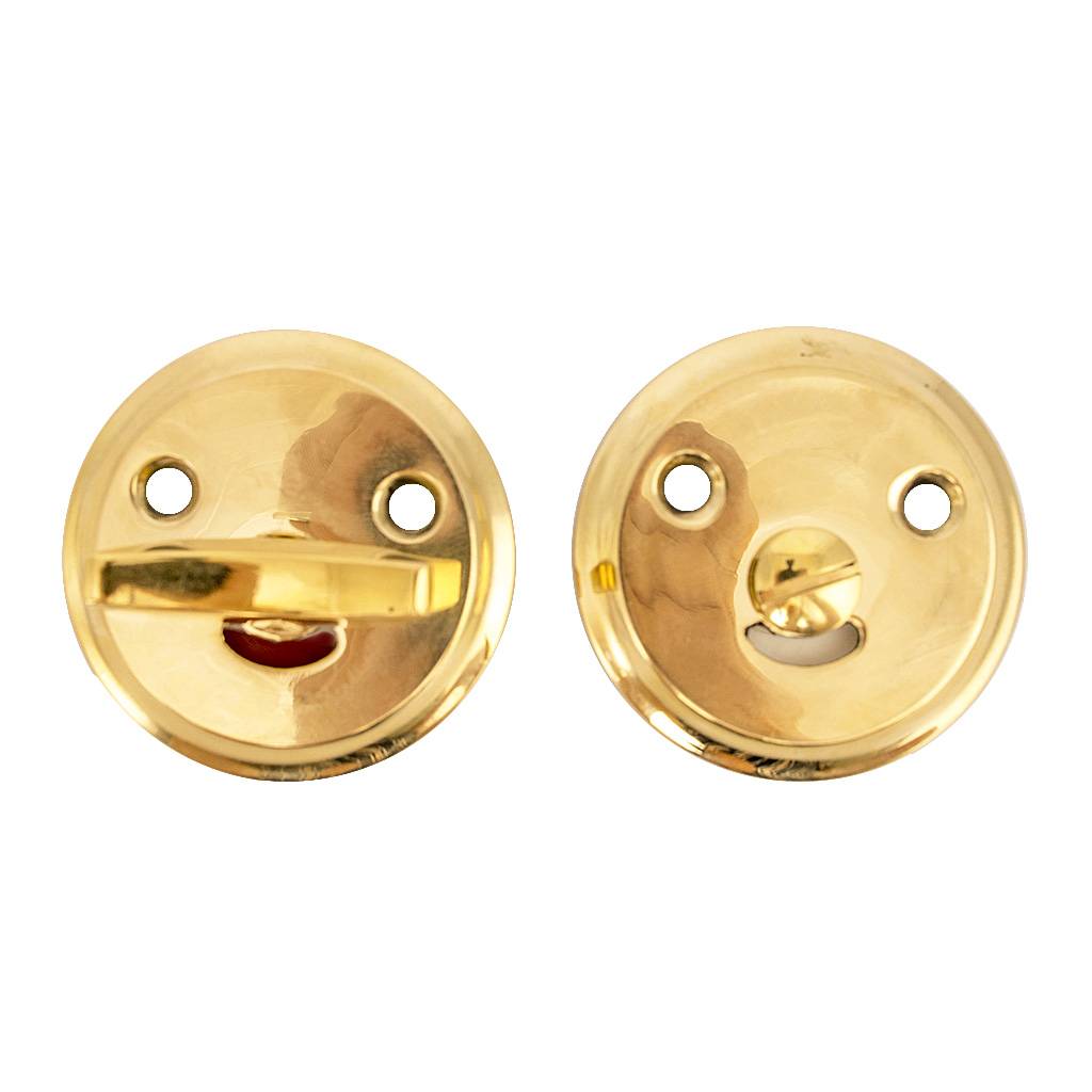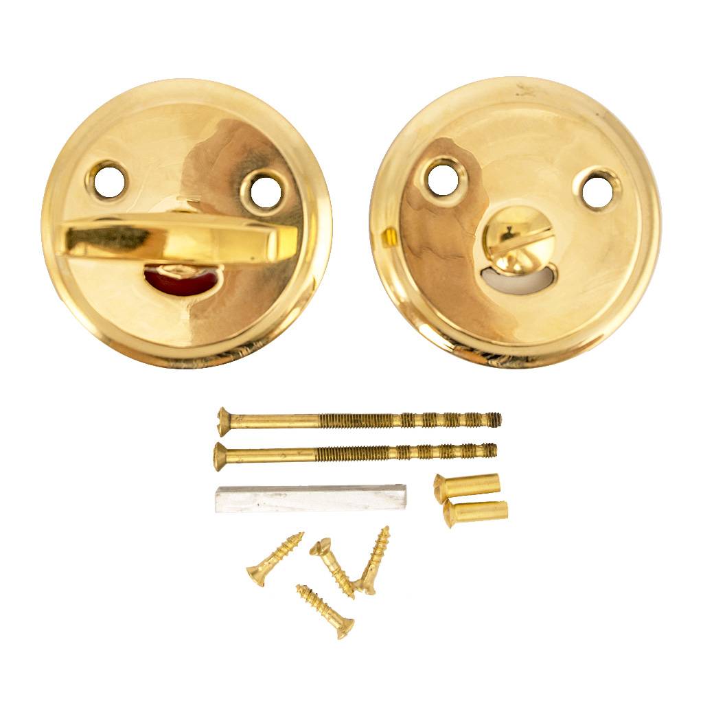 Ein komplettes WC-Türschloss mit Knöpfen aus unbehandeltem Messing, das für moderne Toilettentüren geeignet ist. Das Schild zeigt rot für besetzt und weiß für frei. Lieferung komplett mit Holzschrauben und Durchgangsschrauben (M4). Da das Messing unbehandelt ist, wird es mit der Zeit dunkler. Toilettenschild unlackiertes Messing
